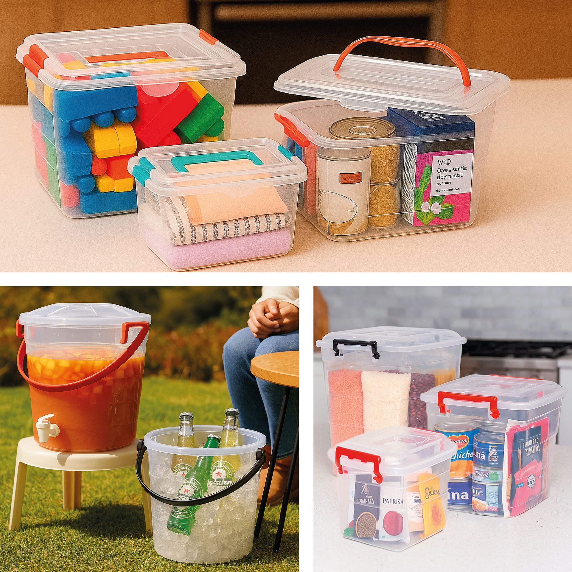 • Baldes multifuncionales, ideales para transportar líquidos o almacenar insumos como detergente en polvo, ingredientes secos o artículos de limpieza.